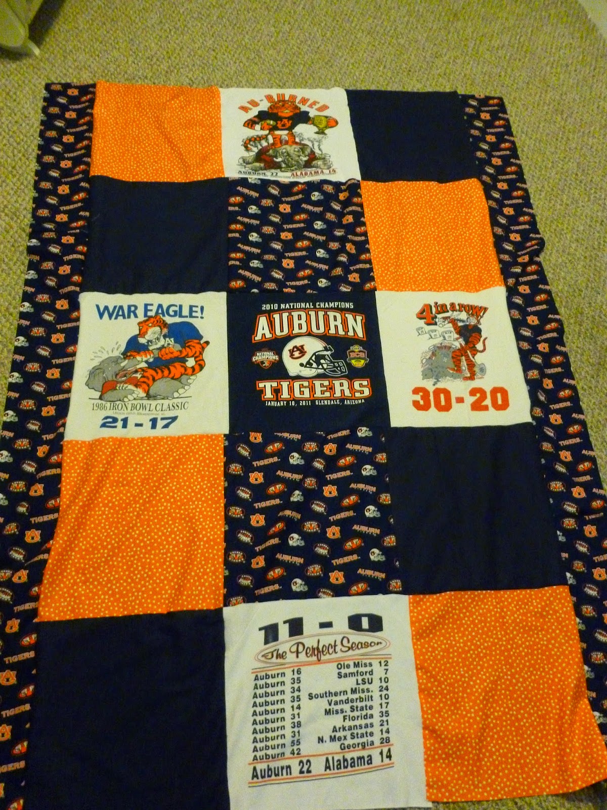 ...and FINALLY, an Auburn throw for my uber-Auburn-fan husband. This one contains sweatshirt tops from way back in the 80s to now! (Binding will be in the orange dotted fabric seen below, and the back will be an Auburn fleece print. Cozy!)