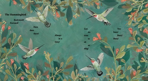 (This one is on a two-page spread, and the stanzas flit across, just like hummingbirds. Beautiful!)The Oriole and the Woodpecker