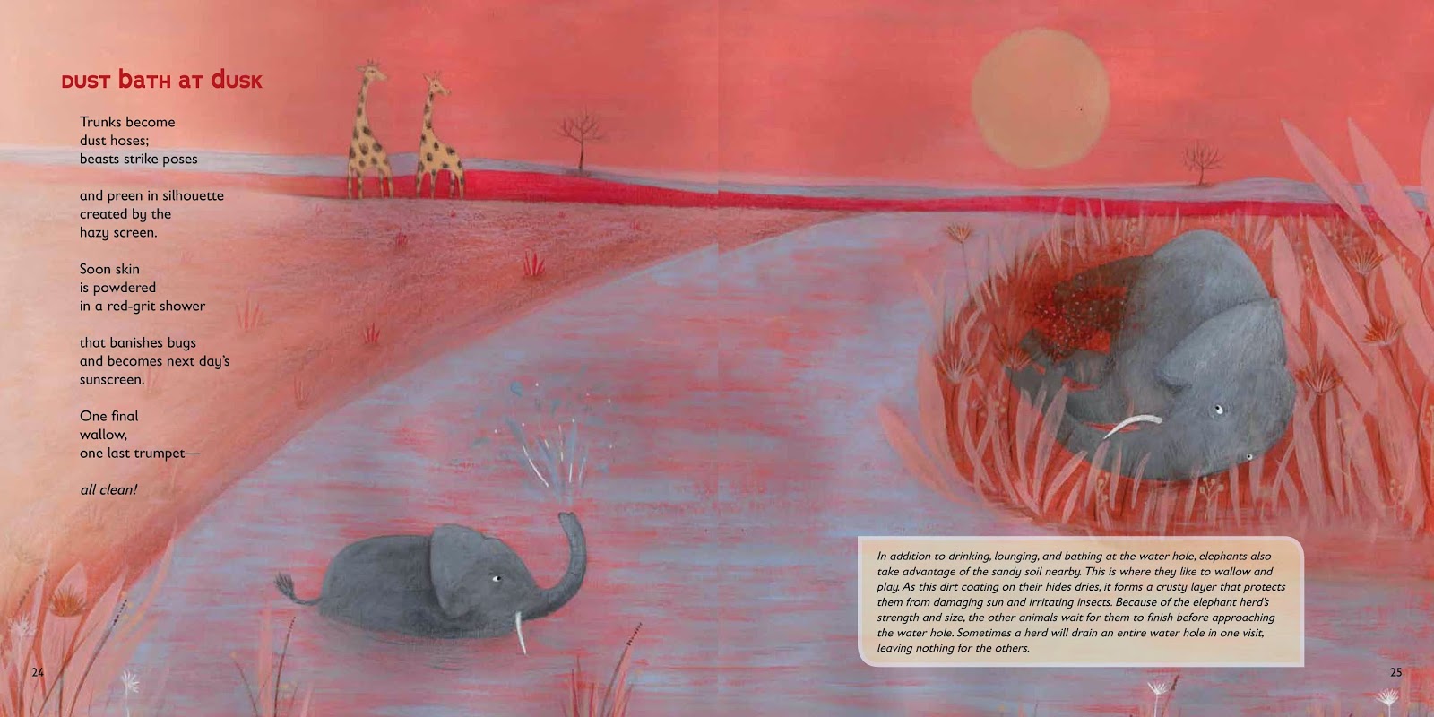 When Millbrook Press acquired the manuscript, there were two elephant poems... the keeper, "Dust Bath at Dusk" appears in the book and illustrator Anna Wadham beautifully used the spread to move the book from the daylight hours to the nighttime ones.
