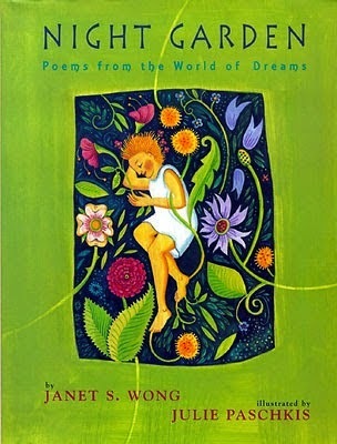 Hello and happy Poetry Friday! Be sure to visit Heidi at my juicy little universe for Roundup.This week I've been savoring NIGHT GARDEN, by Janet S. Wong, illustrations by Julie Paschkis. It's a gorgeous book with poems about the people we dream of and nightmares and even dog dreams! My favorite poem is the final poem in the collection: