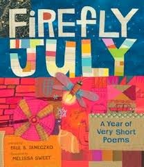 It was my great pleasure this week to pick up FIREFLY JULY: A Year of Very Short Poems selected by Paul B. Janeczko with illustrations by Melissa Sweet. I love that there are poems from both children's poets and adult poems, contemporary poets and not contemporary ones. None of the poems has more than ten lines, and the title poem is by J. Patrick Lewis. Really, really lovely.