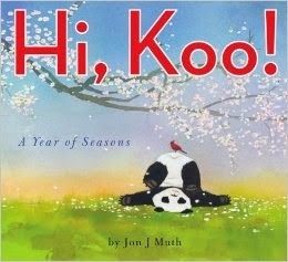 While I was at the workshop, I checked out 6 books of haiku, including HI, KOO! A Year of Seasons, Presented by Koo and Jon J Muth. The illustrations are delightful, and kids will love Koo, the little panda bear, as he (she?) romps through the seasons. To give you a sense of the book, I offer you a poem from each of the seasons: