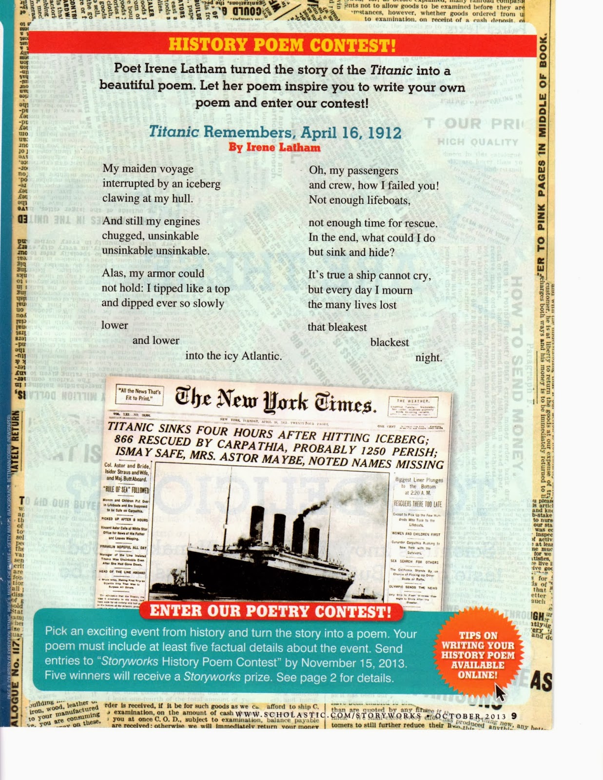 I'm excited to share with you a poem inspired by history: "Titanic Remember April 16, 1912," as it appeared in Scholastic's Storyworks magazine. Elementary teachers, if you are not getting Storyworks, you should! It's an awesome classroom publication, covering all sorts of high-interest topics. I am super-proud and honored to have my own work appear in their pages. Enjoy!