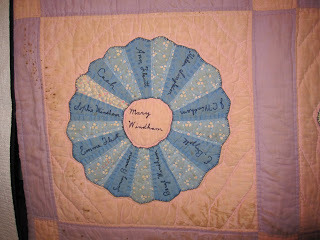 an old-fashioned sampler quilt that includes quilters' names (both stitched and inked)SUCH a beautiful day! I loved meeting so many new friends and sharing a few hours celebrating the creative art of quilting. Do this again next year, I will be there!