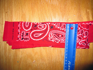 3. Cut strips 2 1/2 to 3 inches wide (doesn't have to be exact- I ended up with 6 strips per bandana)