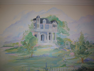 Sometimes Paul and I like to watch those house hunter shows -- I find them just stimulating enough to keep my attention yet there's nothing in them to raise my blood pressure. On one of the shows recently, a young woman was searching for her first house, and the one thing on her "no" list was a porch. She said it made a house look "country." I guess I'm a little bit country because I love a porch! Especially those old-style painted concrete ones with cool steps to sit on. Here's a pic of part of the mural in my dining room. Look: a porch!