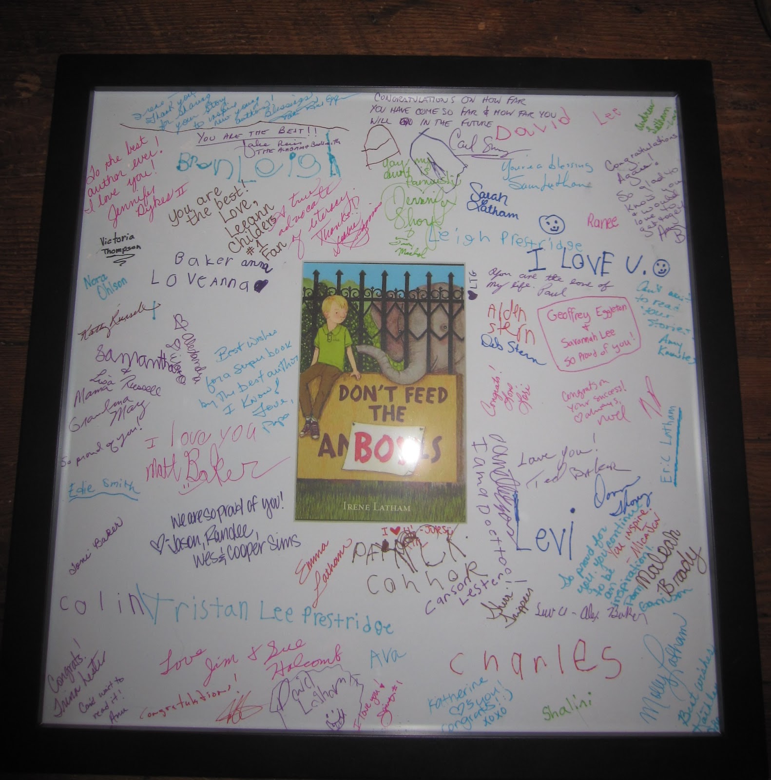 Framed signatures & messages from friendsand readers and loved ones who came to book release events