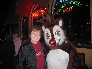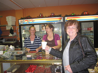 Pat & RudolphWe ate supper at Gibby's (spaghetti & meatball special), then browsed the shops. Our favorite was Wilma's Linens & Lace. (Pat and I are quilters, remember?) We were thrilled to meet Wilma herself, who refashions old quilts pieces into new things of beauty, like Christmas stockings and table runners. Here she is with a piece I completely fell in love with: