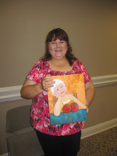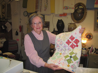 We ate supper at Gibby's (spaghetti & meatball special), then browsed the shops. Our favorite was Wilma's Linens & Lace. (Pat and I are quilters, remember?) We were thrilled to meet Wilma herself, who refashions old quilts pieces into new things of beauty, like Christmas stockings and table runners. Here she is with a piece I completely fell in love with: