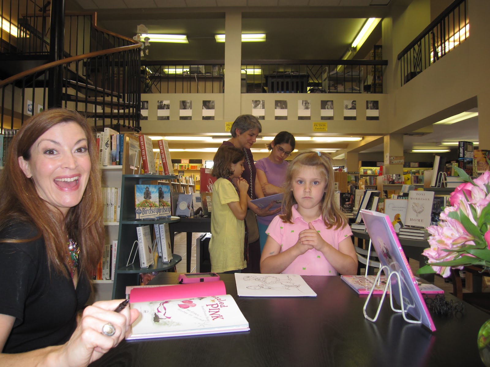 Sarah Frances with a young reader at Little Professor Books. In the background Lori Nichols, whose first picture book will be published next year!