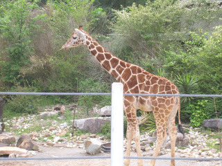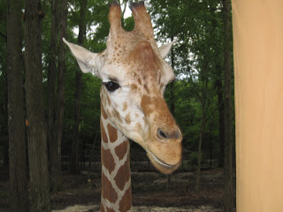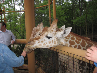 Perhaps you've done a giraffe feeding before, where you stood on a platform and reached up to feed the giraffe.In this exhibit, the enclosure is designed so that the humans and the giraffes are at eye level. And wow, it makes all the difference! You just cannot appreciate a giraffe's heavily lashed eyes or that swirly dark tongue any better way than this.Oh, and I learned something, thanks to my friend Cissy, who is so very generous and amazing and the reason I was at the event in the first place: you can tell the males from the females from a distance by the fur on their antlers: females have fur, males don't. (Males would, except they tussle and fight, and the fur gets rubbed right off.) Fascinating, isn't it?