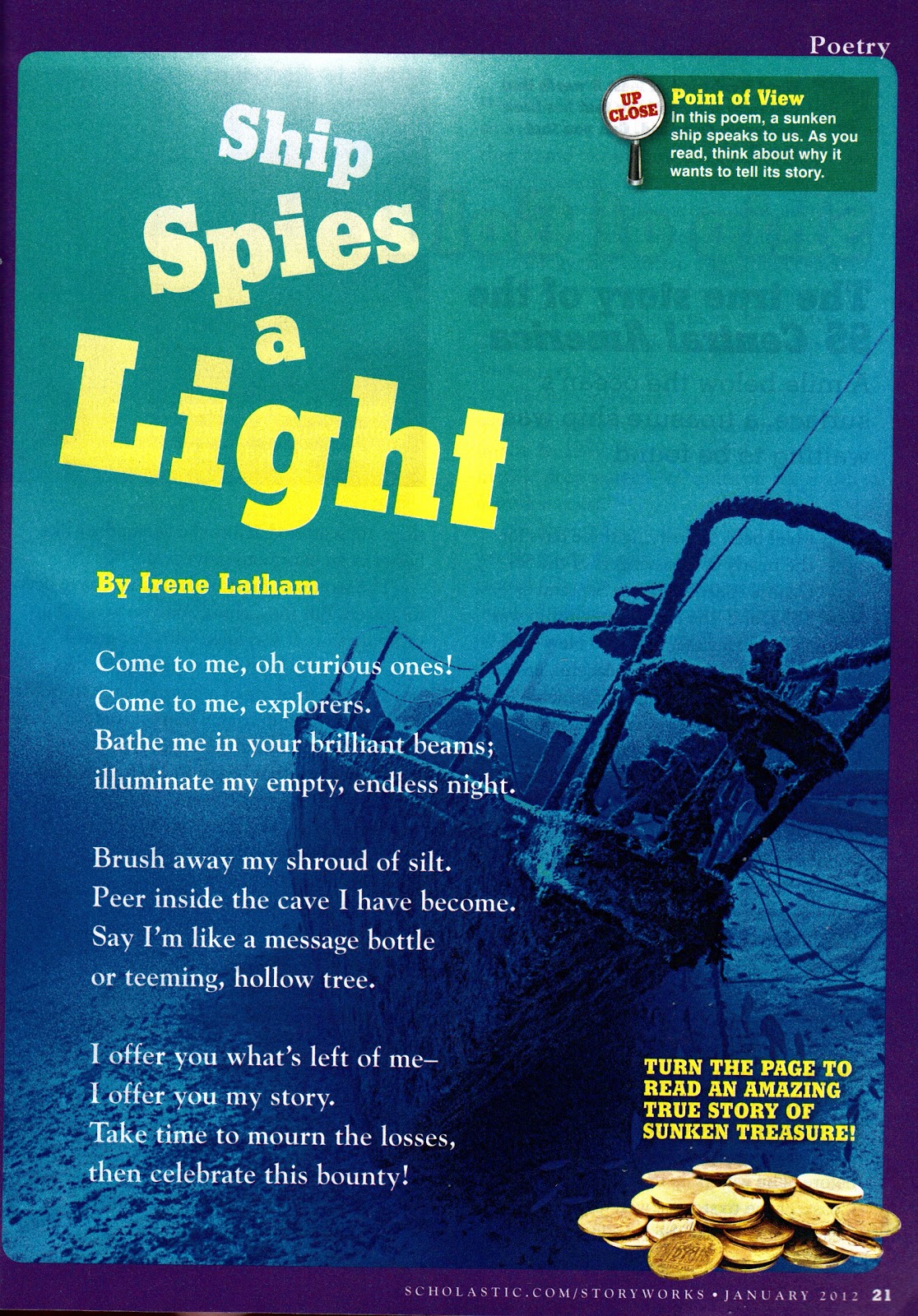 In a week when the 'net has been full of shipwreck news, it seems sort of appropriate that I am finally able to share my poem "Ship Spies a Light" as it appears in Scholastic's