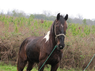 A horse staked out beside Hwy. 29