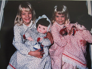 These photos (found at my mother's house) remind me of the little girl who, with her little sister beside her, peeked out the window on Christmas Eve until they saw Rudolph's red nose blinking across the sky. Then those girls scrambled into bed and squeezed their eyes tight so Santa would guide those reindeer to the roof of their house and leave the long-wished-for presents (like matching dolls! Mama knew what little girls liked long before American Girl or My Twinn).