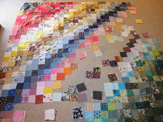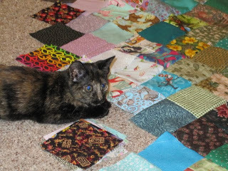 So I've been working on my 2010 quilt project. Youngest son Eric and new kitten Maggie have been helping A LOT. We decided to go with a diagonal color wash, which I really love. The final square count will be 729. Bad news: I ran out of fabric!