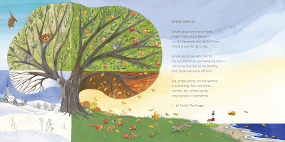 Nancy Tupper LingNTL: As an author who can barely draw a stick figure, I find “the delicious” to be that moment when I receive the first sketch or two from the illustrator. In the case of FOR EVERY LITTLE THING, this happened when June Cotner and I got a sneak peak at a few of Helen Cann’s sketches, including the “Nightfall” chapter and a full-page spread, which reflected all four seasons in one glorious tree. Ultimately, the tree was paired with a poem by Jill Noblit MacGregor called "Simple Graces" and it is stunning (shown below!), That experience was as delicious as picking the first Empire apple in a New England fall. Ah!