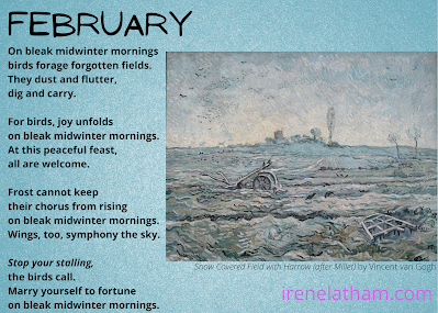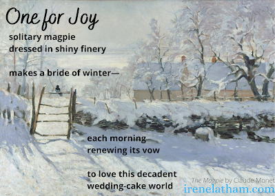 Today's ArtSpeak poem is inspired by Monet's magpie, and a little rhyme you have heard about magpies that begins "One for sorrow..." Well, I wanted to turn that upside down. Thank you so much for reading!