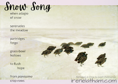 And yet... it's still winter. So today I have another snow poem for you. It was inspired by one of my favorite haiku (below!), which sets you up for one thing in the first two lines, and then really surprises you in the last line... the "turn," for which traditional haiku is known (and what makes it so incredibly challenging to pull off)!