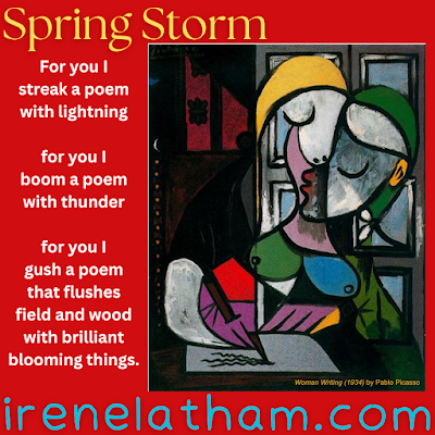 And now for today's ArtSpeak: PICASSO poem. I found myself (again!) writing on a stormy morning. I decided to try a tricube. But then the poem demanded to be set free from that constraint...so I let it storm its way onto the page just the way it wanted to. Thanks so much for reading...wishing all of you spring storms like this one!