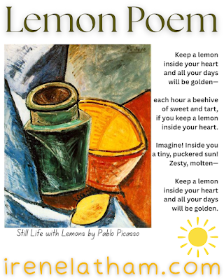 Today's ArtSpeak: PICASSO poem is a still life. It can be a real challenge to write a lively poem after a still life! But. I love lemons. And the morning I was writing this poem I had just blended a giant, seedless lemon into our morning veggie juice (spinach, cucumber, zucchini, lemon). The scent of lemons filled the kitchen!
