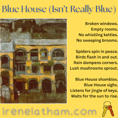 Meanwhile, here is my poem. Picasso titled his piece "A Blue House." It is a sad house, but it isn't really blue! So that became the theme of my poem. I could have just titled it simply "Blue House," but I wanted the reader to know right up front that this isn't a sad poem. This house is more complicated than that! Thanks so much for reading.