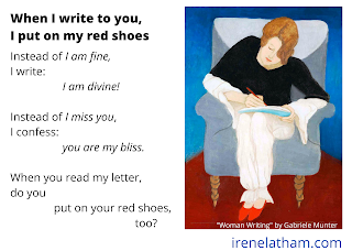 <!-- @page { margin: 0.79in } P { margin-bottom: 0.08in } </style> <br />--> <div style="font-style: normal; margin-bottom: 0in;"><b>When I write to you,</b></div><div style="font-style: normal; margin-bottom: 0in;"><b>I put on my red shoes</b></div><div style="font-style: normal; margin-bottom: 0in;"><br /></div><div style="font-style: normal; margin-bottom: 0in;">Instead of <i>I am fine,</i></div><div style="font-style: normal; margin-bottom: 0in;">I write: </div><div style="font-style: normal; margin-bottom: 0in;"> I<i>am divine!</i></div><div style="font-style: normal; margin-bottom: 0in;"><br /></div><div style="font-style: normal; margin-bottom: 0in;">Instead of <i>I miss you,</i></div><div style="font-style: normal; margin-bottom: 0in;">I confess:</div><div style="font-style: normal; margin-bottom: 0in;"><i> you are my bliss.</i></div><div style="font-style: normal; margin-bottom: 0in;"><br /></div><div style="font-style: normal; margin-bottom: 0in;">When you read my letter,</div><div style="font-style: normal; margin-bottom: 0in;">do you </div><div style="font-style: normal; margin-bottom: 0in;"> put on your red shoes, </div><div style="font-style: normal; margin-bottom: 0in;"> too?</div><div style="margin-bottom: 0in;"><i><br /></i></div><i>- Irene Latham</i>