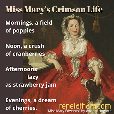 Today I have for you another ArtSpeak: Red poem. This one's inspired by "Miss Mary Edwards" by William Hogarth. I do have a Miss Mary in my life -- though she is nothing like the Miss Mary pictured here! Do you know anyone who enjoys a "crimson life" like the person portrayed in the poem?
