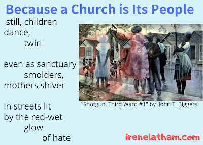 in streets litby the red-wet glow <!-- @page { margin: 0.79in } P { margin-bottom: 0.08in } </style> </div>--> <div style="margin-bottom: 0in;"> of hate</div><div style="margin-bottom: 0in;"><br /></div><div style="margin-bottom: 0in;"><i>- Irene Latham</i></div><br /><br />