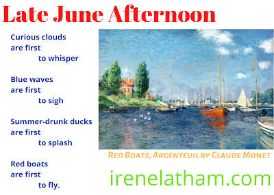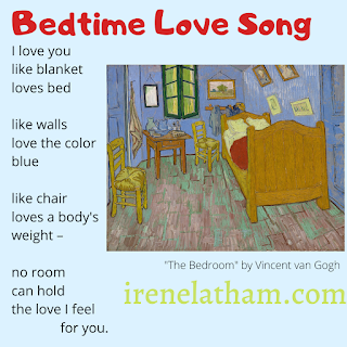 <!-- @page { margin: 0.79in } P { margin-bottom: 0.08in } </style> <br />--> <br /><div style="margin-bottom: 0in;"><b>Bedtime Love Song</b></div><div style="margin-bottom: 0in;"><br /></div><div style="margin-bottom: 0in;">I love you</div><div style="margin-bottom: 0in;">like red blanket</div><div style="margin-bottom: 0in;">loves bed</div><div style="margin-bottom: 0in;"><br /></div><div style="margin-bottom: 0in;">like walls</div><div style="margin-bottom: 0in;">love the color</div><div style="margin-bottom: 0in;">blue</div><div style="margin-bottom: 0in;"><br /></div><div style="margin-bottom: 0in;">like chair</div><div style="margin-bottom: 0in;">loves a body's</div><div style="margin-bottom: 0in;">weight –</div><div style="margin-bottom: 0in;"><br /></div><div style="margin-bottom: 0in;">no room</div><div style="margin-bottom: 0in;">can hold </div><div style="margin-bottom: 0in;">the love I feel </div><div style="margin-bottom: 0in;"> for you.</div><br /><br /><i>- Irene Latham</i><br /><i><br /></i>... and here is a <a href="https://irenelatham.blogspot.com/2019... to another Valentine's Day set of poems: one by Aileen Fisher, one by me. :)
