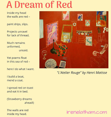 And now, here's a red poem, inspired by the badge art for the series: "L'Atelier"(the studio) by Henri Matisse. I immediately thought: that's what it must look like inside my brain!