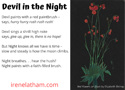 <!-- @page { margin: 0.79in } P { margin-bottom: 0.08in } </style> <br />--> <div style="margin-bottom: 0in;"><b>Devil in the Night</b></div><div style="margin-bottom: 0in;"><br /></div><div style="margin-bottom: 0in;">Devil paints with a red paintbrush –</div><div style="margin-bottom: 0in;">says, <i>hurry hurry rush rush rush</i></div><div style="margin-bottom: 0in;"><br /></div><div style="margin-bottom: 0in;">Devil sings a shrill high note</div><div style="margin-bottom: 0in;">says, <i>give up, give in, there is no hope!</i></div><div style="margin-bottom: 0in;"><br /></div><div style="margin-bottom: 0in;">But Night knows all we have is time –</div><div style="margin-bottom: 0in;">slow and steady is how the moon climbs.</div><div style="margin-bottom: 0in;"><br /></div><div style="margin-bottom: 0in;">Night breathes. . . hear the hush?</div><div style="margin-bottom: 0in;">Night paints with a faith-filled brush.</div><div style="margin-bottom: 0in;"><br /></div><div style="margin-bottom: 0in;"><i>- Irene Latham</i></div><span style="background-color: white;"><span style="font-family: "times" , "times new roman" , serif;"></span></span>
