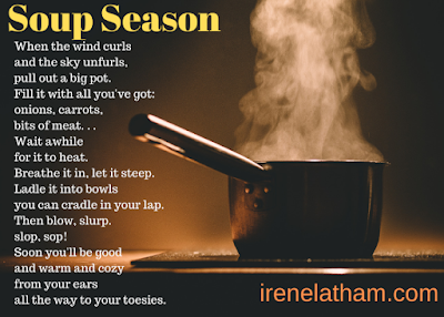 When the wind curlsand the sky unfurls,pull out a big pot.Fill it with all you've got:onions, carrots, bits of meat. . .Wait awhile for it to heat.Breathe it in, let it steep.Ladle it into bowlsyou can cradle in your lap.Then blow, slurp.slop sop!Soon you'll be goodand warm and cozyfrom your earsall the way to your toesies.