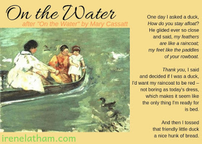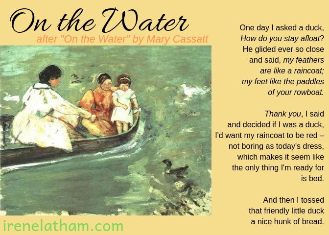 <!-- @page { margin: 0.79in } P { margin-bottom: 0.08in } </style> </div><br /><div style="font-style: normal; margin-bottom: 0in;"></div><div style="font-style: normal; margin-bottom: 0in;"><b>On the Water</b></div><div style="margin-bottom: 0in;"><i>- after "On the Water 1895" by Mary Cassatt</i><br /><i><br /></i></div><div style="margin-bottom: 0in;"><i></i></div><div style="font-style: normal; margin-bottom: 0in;">One day I asked a duck,</div><div style="margin-bottom: 0in;"><i>How do you stay afloat?</i></div><div style="font-style: normal; margin-bottom: 0in;">He glided ever so close </div><div style="font-style: normal; margin-bottom: 0in;">and said, <i>my feathers </i></div><div style="font-style: normal; margin-bottom: 0in;"><i>are like a raincoat;</i></div><div style="margin-bottom: 0in;"><i>my feet like the paddles </i></div><div style="margin-bottom: 0in;"><i>of your rowboat.</i></div><div style="margin-bottom: 0in;"></div><div style="font-style: normal; margin-bottom: 0in;"><i>Thank you,</i> I said</div><div style="font-style: normal; margin-bottom: 0in;">and decided if I was a duck,</div><div style="font-style: normal; margin-bottom: 0in;">I'd want <i>my</i>raincoat to be red –</div><div style="font-style: normal; margin-bottom: 0in;">not boring as today's dress,</div><div style="font-style: normal; margin-bottom: 0in;">which makes it seem like</div><div style="font-style: normal; margin-bottom: 0in;">the only thing I'm ready for</div><div style="font-style: normal; margin-bottom: 0in;">is bed.</div><div style="font-style: normal; margin-bottom: 0in;"></div><div style="font-style: normal; margin-bottom: 0in;">And then I tossed </div><div style="font-style: normal; margin-bottom: 0in;">that friendly little duck</div><div style="font-style: normal; margin-bottom: 0in;">a nice hunk of bread.<br /><br /></div><div style="font-style: normal; margin-bottom: 0in;"></div><div style="margin-bottom: 0in;"><i>- Irene Latham</i><br /><i><br /></i><i>---</i><br />So, I've been having a bit of a crisis with the videos. I'm tired of doing them and don't enjoy seeing my face! AND... the worst part: no art! So I decided to try something different. Let me know what you think!<br /><br /></div><iframe allow="accelerometer; autoplay; encrypted-media; gyroscope; picture-in-picture" allowfullscreen="" frameborder="0" height="315" src="https://www.youtube.com/embed/9r2PPtd..." width="560"></iframe> <br /><br /><div class="separator" style="clear: both; text-align: center;"><a href="https://2.bp.blogspot.com/-RBwG26Kj2V..." imageanchor="1" style="clear: right; float: right; margin-bottom: 1em; margin-left: 1em;"><img border="0" data-original-height="481" data-original-width="672" height="228" src="https://2.bp.blogspot.com/-RBwG26Kj2V..." width="320" /></a></div>Be sure to visit Carol at <a href="https://beyondliteracylink.blogspot.c... LiteracyLink</a> for the latest line in our Progressive Poem!