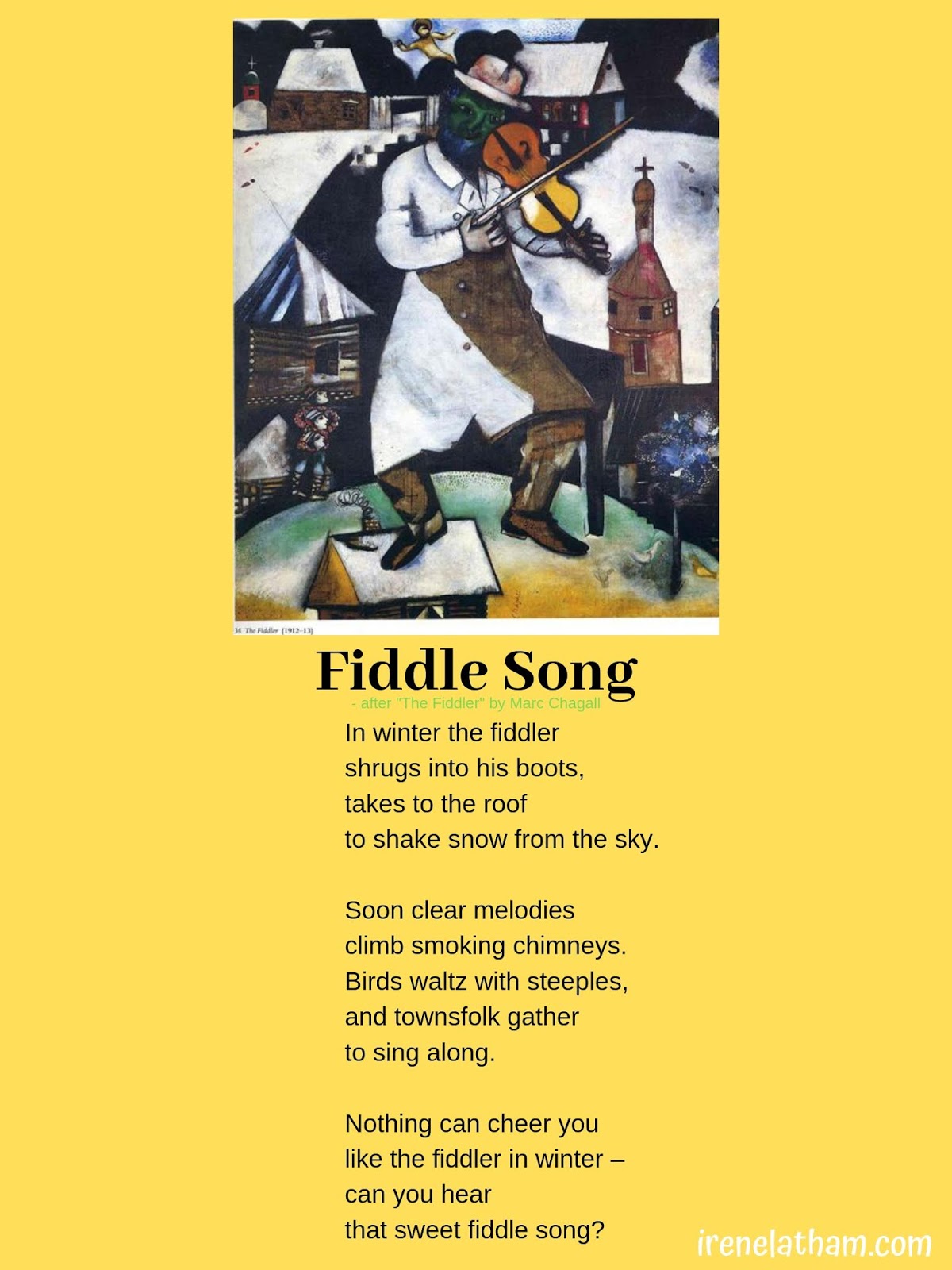 Today's piece is The Fiddler by Marc Chagall. This one was a bit of a challenge for me. While fiddle music generally makes me happy, this piece could be interpreted as "blue." But this is intended to be a happy poem, so I had to abandon those blue thoughts... and it was hard! Anyhow, this is where I landed.