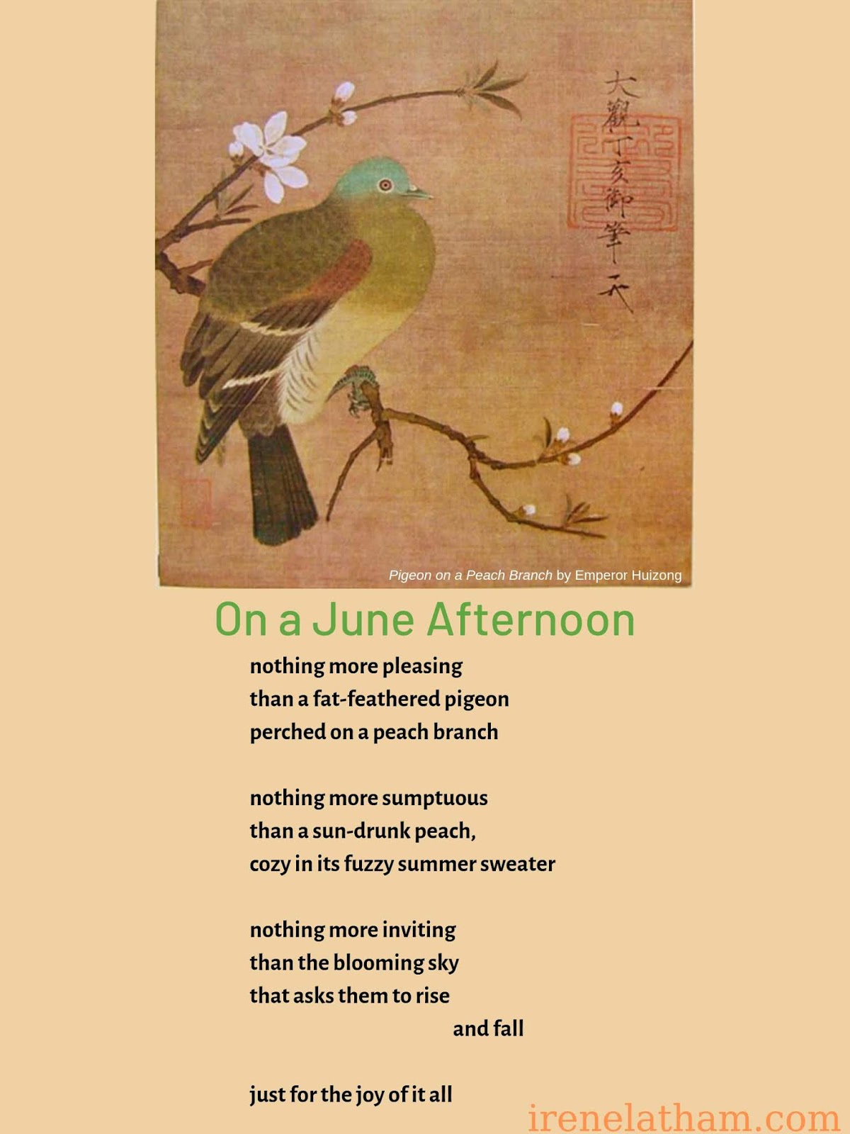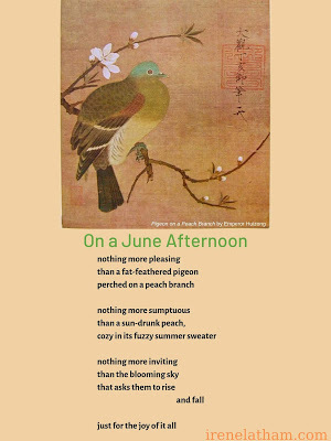 Today's piece is Pigeon on a Peach Branch by Emperor Huizong. I'm a Georgia peach... born in Georgia... and I have lots of happy peachy childhood memories! Though this poem cheats a little... peach blossom season is in June, and peach picking season is in July.... so maybe this is late June, with two different varieties of peach? Thank goodness poetry allows this kind of peach-jam making! xo