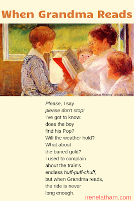 Please, I sayplease don't stop!I've got to know:does the boyfind his Pop?Will the weather hold?What about the buried gold?I used to complainabout the train'sendless huff-puff-chuff,but when Grandma reads,the ride is neverlong enough. <!-- @page { margin: 0.79in } P { margin-bottom: 0.08in } </style> <br />--> <div style="margin-bottom: 0in;"><i><br /></i></div><div style="margin-bottom: 0in;"><i>- Irene Latham</i></div><br /><iframe allow="accelerometer; autoplay; encrypted-media; gyroscope; picture-in-picture" allowfullscreen="" frameborder="0" height="315" src="https://www.youtube.com/embed/UL301TA..." width="560"></iframe><br /><br /><div class="separator" style="clear: both; text-align: center;"><a href="https://4.bp.blogspot.com/-CKfoN4dOA5..." imageanchor="1" style="clear: right; float: right; margin-bottom: 1em; margin-left: 1em;"><img border="0" data-original-height="481" data-original-width="672" height="228" src="https://4.bp.blogspot.com/-CKfoN4dOA5..." width="320" /></a></div>Be sure to visit Christie at <a href="https://wonderingandwondering.wordpre... and Wandering</a> for the latest line in our Progressive Poem!<br /><br />