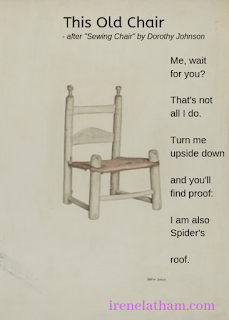 This Old Chair<!-- @page { margin: 0.79in } P { margin-bottom: 0.08in } </style> </div></div>--> <div style="margin-bottom: 0in;"><i>- after “Sewing Chair” by Dorothy Johnson</i></div><div style="margin-bottom: 0in;"><br /></div><div style="margin-bottom: 0in;">Me, wait</div><div style="margin-bottom: 0in;">for you?</div><div style="margin-bottom: 0in;"><br /></div><div style="margin-bottom: 0in;">That's not</div><div style="margin-bottom: 0in;">all I do.</div><div style="margin-bottom: 0in;"><br /></div><div style="margin-bottom: 0in;">Turn me</div><div style="margin-bottom: 0in;">upside down</div><div style="margin-bottom: 0in;"><br /></div><div style="margin-bottom: 0in;">and you'll</div><div style="margin-bottom: 0in;">find proof:</div><div style="margin-bottom: 0in;"><br /></div><div style="margin-bottom: 0in;">I am also</div><div style="margin-bottom: 0in;">Spider's</div><div style="margin-bottom: 0in;"><br /></div><div style="margin-bottom: 0in;">roof.</div><div style="margin-bottom: 0in;"><br /></div><div style="margin-bottom: 0in;"><i>- Irene Latham</i></div><div style="margin-bottom: 0in;"><br /></div><div style="margin-bottom: 0in;"><br /></div><b>... and now today's writing:</b><br /><div style="margin-bottom: 0in;">I was a picky eater as a child. Maybe this wouldn't have been a big deal in some families, but in mine the rule was “clean your plate.” There were times when I couldn't – or wouldn't – clean my plate. (Word choice there is completely dependent upon whether you were asking me or my mom!) On those nights, while my siblings played board games or watched a family movie, I spent the evening hours sitting at the kitchen table staring at the green beans (or whatever) on my plate. On those nights the hard ladder-backed kitchen chair became a boat or cave or spaceship. I'd push the chair back from the table and bring my knees up to my chest – a habit I still have today. I imagined and dreamed my way through those awful hours. Eventually the chair would become a chair again, harder than ever, so I would quickly stuff those green beans into my cheeks and dash for the bathroom, where I would spit them into the toilet. </div><div style="margin-bottom: 0in;">---------</div><div style="margin-bottom: 0in;">For those of you out there who may be parenting picky eaters, I can tell you that this practice did NOT help me learn to love my vegetables. It DID make me super-compassionate when it came to raising my own picky eaters! The “clean your plate” rule was not one we chose to continue. And these days I'll eat pretty much anything – though I still don't lovelovelove green beans. :)</div><style type="text/css"> <!-- @page { margin: 0.79in } P { margin-bottom: 0.08in } </style> <br />--> <div style="margin-bottom: 0in;">-------------</div>Finally, a poem that appears in my out-of-print book of poems for adults <a href="https://www.irenelatham.com/color_rev... COLOR OF LOST ROOMS</a>, which includes a number of ekphrastic poems. Now you know exactly where this one comes from... and how poetry is often a blend of fact and imagination.<br /><div class="separator" style="clear: both; text-align: center;"><a href="https://2.bp.blogspot.com/-E6G521YgjG..." imageanchor="1" style="margin-left: 1em; margin-right: 1em;"><img border="0" data-original-height="1056" data-original-width="816" height="400" src="https://2.bp.blogspot.com/-E6G521YgjG..." width="308" /></a></div><br /><br /><div class="separator" style="clear: both; text-align: center;"></div><div style="margin-bottom: 0.08in;"><style type="text/css"> <!-- @page { margin: 0.79in } P { margin-bottom: 0.08in } </style> </div>--> <div style="line-height: 100%; margin-bottom: 0in;"><span style="font-family: "times new roman" , serif;"><span style="font-size: small;"><b>Alligator Pears in a Basket</b></span></span></div><div style="line-height: 100%; margin-bottom: 0in;"><span style="font-family: "times new roman" , serif;"><b>- </b></span><i style="font-family: "Times New Roman", serif;">after the painting by Georgia O’Keefe</i></div><div style="line-height: 100%; margin-bottom: 0in;"><br /></div><div style="line-height: 100%; margin-bottom: 0in;"><span style="font-family: "times new roman" , serif;"><span style="font-size: small;"><i>Eat</i></span></span><span style="font-family: "times new roman" , serif;"><span style="font-size: small;">, his mother said. </span></span><span style="font-family: "times new roman" , serif;"><span style="font-size: small;"><i>You must</i></span></span></div><div style="line-height: 100%; margin-bottom: 0in;"><span style="font-family: "times new roman" , serif;"><span style="font-size: small;"><i>clean your plate.</i></span></span><span style="font-family: "times new roman" , serif;"><span style="font-size: small;"> He crossed</span></span></div><div style="line-height: 100%; margin-bottom: 0in;"><span style="font-family: "times new roman" , serif;"><span style="font-size: small;">his arms and clamped his teeth.</span></span></div><div style="line-height: 100%; margin-bottom: 0in;"><span style="font-family: "times new roman" , serif;"><span style="font-size: small;">Sat at the table for hours.</span></span></div><div style="line-height: 100%; margin-bottom: 0in;"><br /></div><div style="line-height: 100%; margin-bottom: 0in;"><span style="font-family: "times new roman" , serif;"><span style="font-size: small;">By bedtime his mother’s eyes</span></span></div><div style="line-height: 100%; margin-bottom: 0in;"><span style="font-family: "times new roman" , serif;"><span style="font-size: small;">blazed. </span></span><span style="font-family: "times new roman" , serif;"><span style="font-size: small;"><i>You can’t make me</i></span></span><span style="font-family: "times new roman" , serif;"><span style="font-size: small;">, </span></span></div><div style="line-height: 100%; margin-bottom: 0in;"><span style="font-family: "times new roman" , serif;"><span style="font-size: small;">the