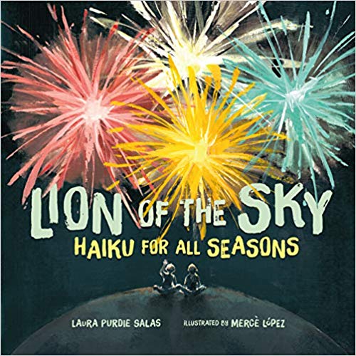 Pre-orders available NOW.you'll find the linkup below, and today I want to share with you a beautiful book of poems by one of our own: LION OF THE SKY: Haiku for all Seasons by Laura Purdie Salas, illustrations by Merce Lopez, brought to us by the good folks at Lerner Publishing (April 2, 2019).This book is beautiful, both in words and pictures. Laura has graciously given me permission to share one poem for each season, and boy was it hard to pick! These poems aren't haiku for the haiku purist -- they do follow the 5-7-5 syllable scheme, but they are bursting with all sorts of rich, evocative metaphors -- which aren't employed in traditional haiku, where the focus is on the literal experience of the moment. Helpful article about tenets of traditional haiku found here.