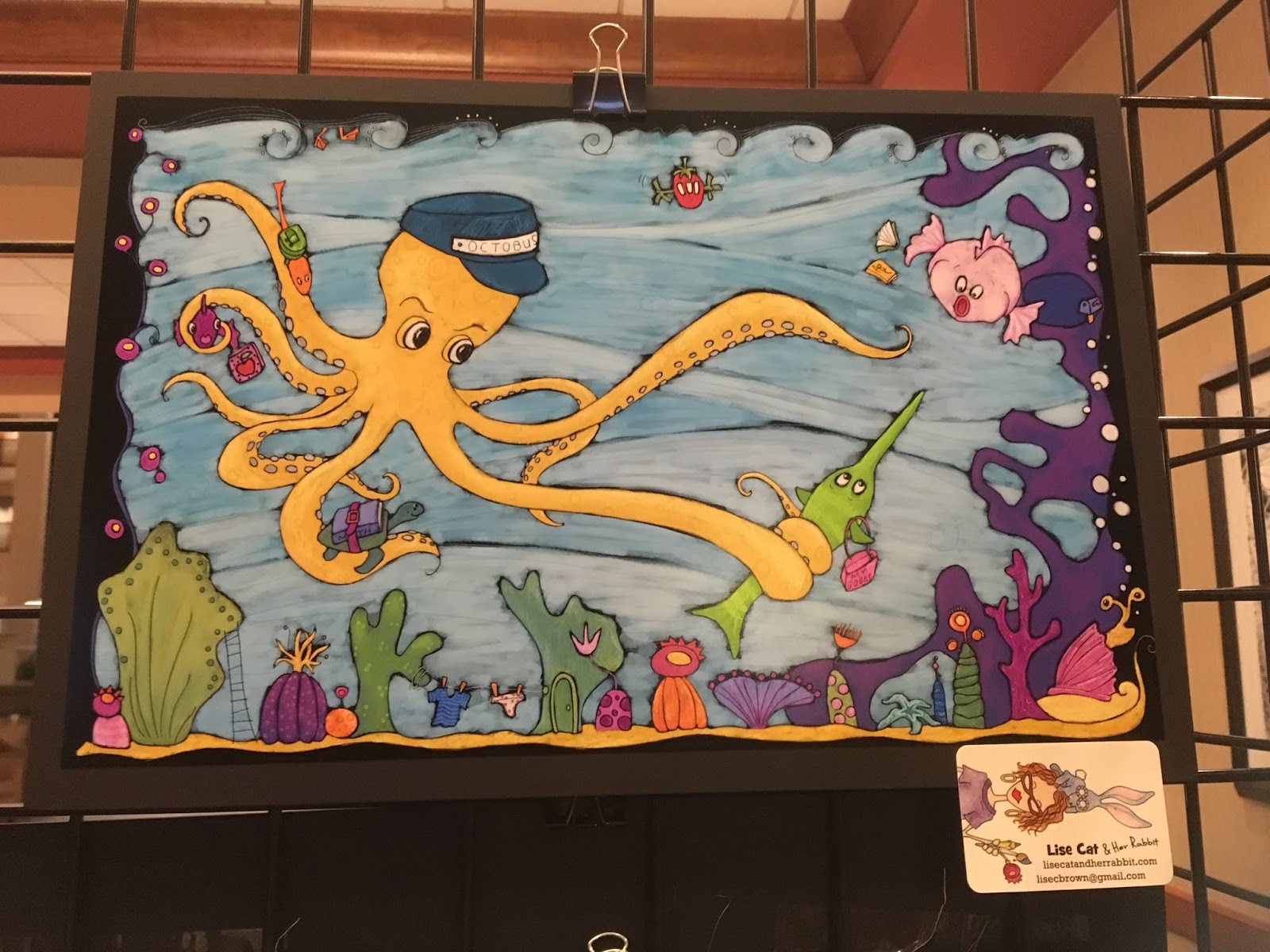 One of the things I love about attending SCBWI conferences is the illustrator displays. I was especially excited when I saw this one by Lisa C Brown featuring an octopus as an octo-bus!