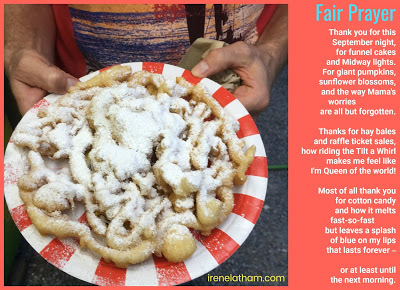 Thank you for thisSeptember night,for funnel cakes and Midway lights.For giant pumpkins, sunflower blossoms,and the way Mama's worries are all but forgotten.