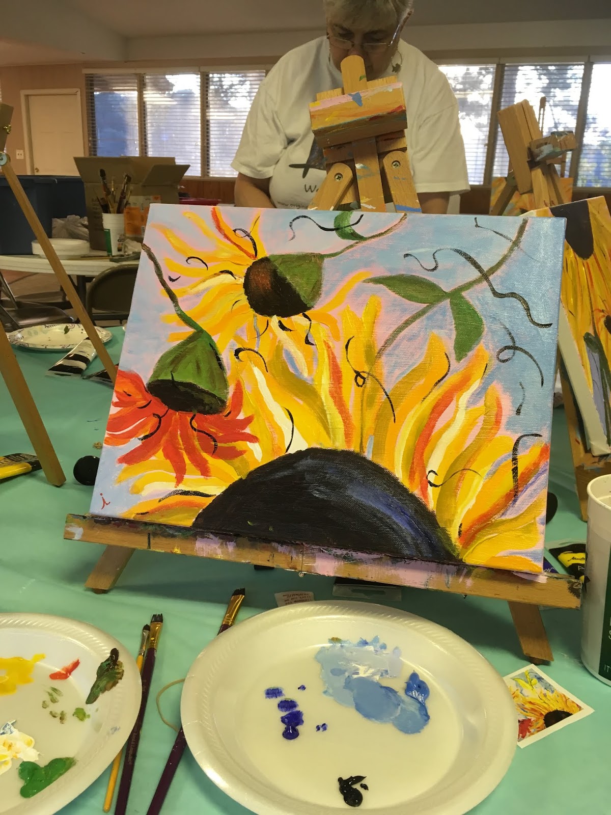 Carolyn, Irene, Cathryn, Connie, Susan, Allie, GraceAfter I got home I decided to work on improving my canvas... I've got no wall space, and it's all about learning, right? So why not?... using paint I had at home, I brought my petals down around the seed pods on each of the smaller blooms. I learned it just didn't pop, because I didn't have the same paint colors! AND THEN... I painted over the entire canvas - a nice soft blue - to try something else. Maybe even another sunflower, I'm not sure yet. I got sidetracked with a fall quilting project. More on that soon! :)