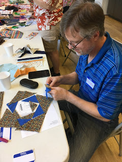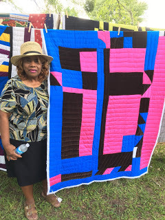 But the best part? Watching Paul put in his very first stitches on his own potholder! Minnie came over and got Paul set up, and then he went to town. I was super impressed with his tight, even stitches... especially as I opted for machine stitching both for the piecing and the quilting. Not Paul! He did it old-school. Fun!On our way out, we stopped in at Mary Margaret Pettway's house where Marlene had her quilts out in glorious display. She told us stories behind many of the quilts, and we walked away with this one: