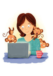 Lisa at her desk.And I was surprised at how often I needed to let those words be changed to achieve the book sale. (Not complaining: Many of the changes made it better.) Now, though, when I read TWO BY TWO aloud, I have to peek at certain lines to make sure I’m reading what’s on the page instead of saying what I originally wrote.Anything else: Having a book that features monkeys gave me an opening to do some social media beyond the usual “buy my book” posts. I took two monkey finger puppets to Greece on a recent vacation. My premise is that the monkeys are taking a vacation before “their” book comes out. For the 40 days leading up to the publication date I’ve posted