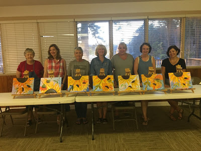 Lady Lakers!We also gathered for a painting class (with delicious finger foods, too, of course), which was a great learning experience for me! We each had 11 x 14 canvases, and we were using acrylics. Judy Ritter served as our instructor for "Dance of the Sunflowers." (you can see the "model" piece at the above link)