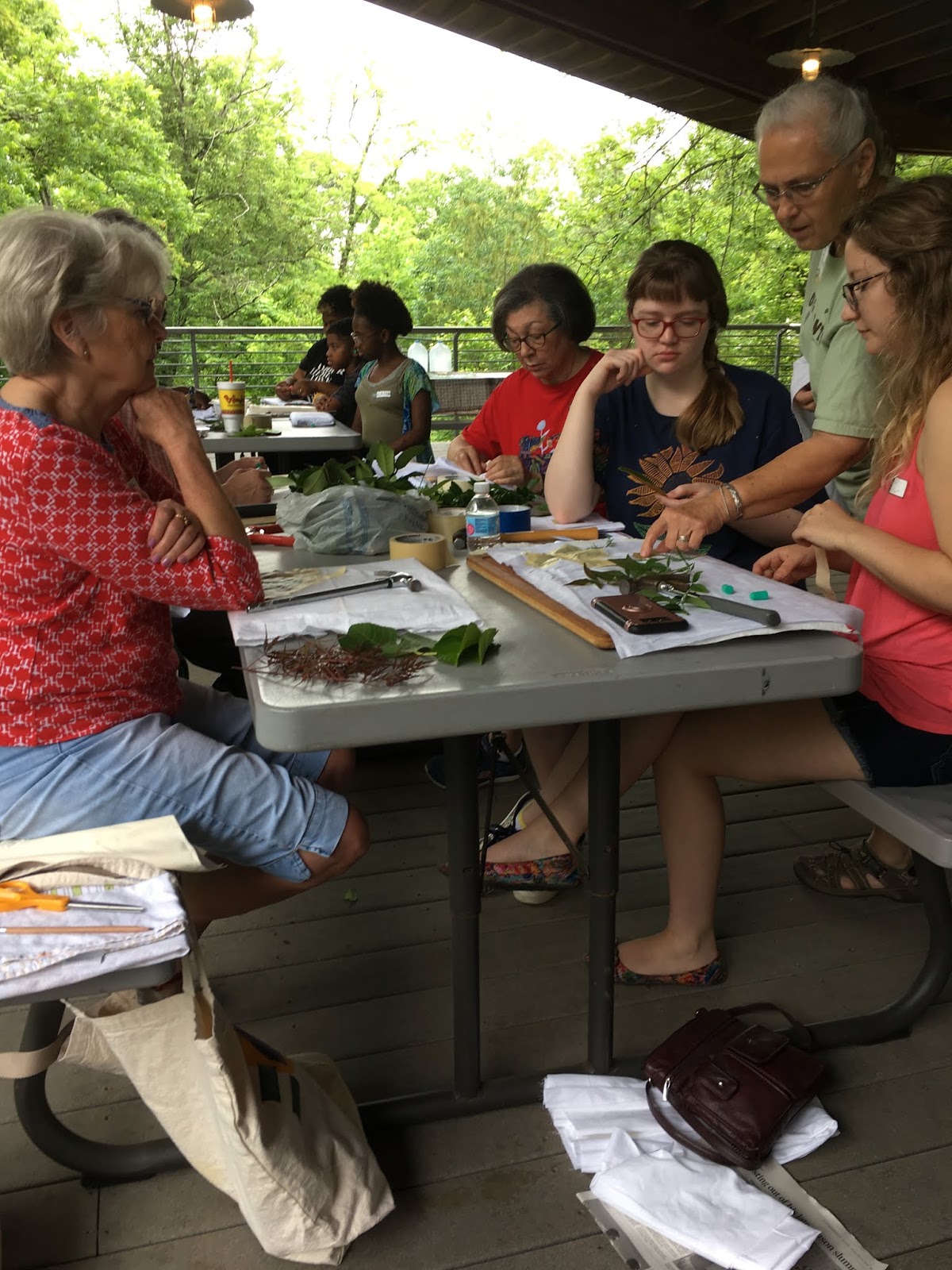 selecting our leaves So a group of us met at Ruffner Mountain Nature Preserve to practice transfering leaves to fabric. It requires a hammer or hammerstone, some earplugs, a piece of wood, some newspaper, paper towel, masking tape, leaves... and imagination!