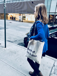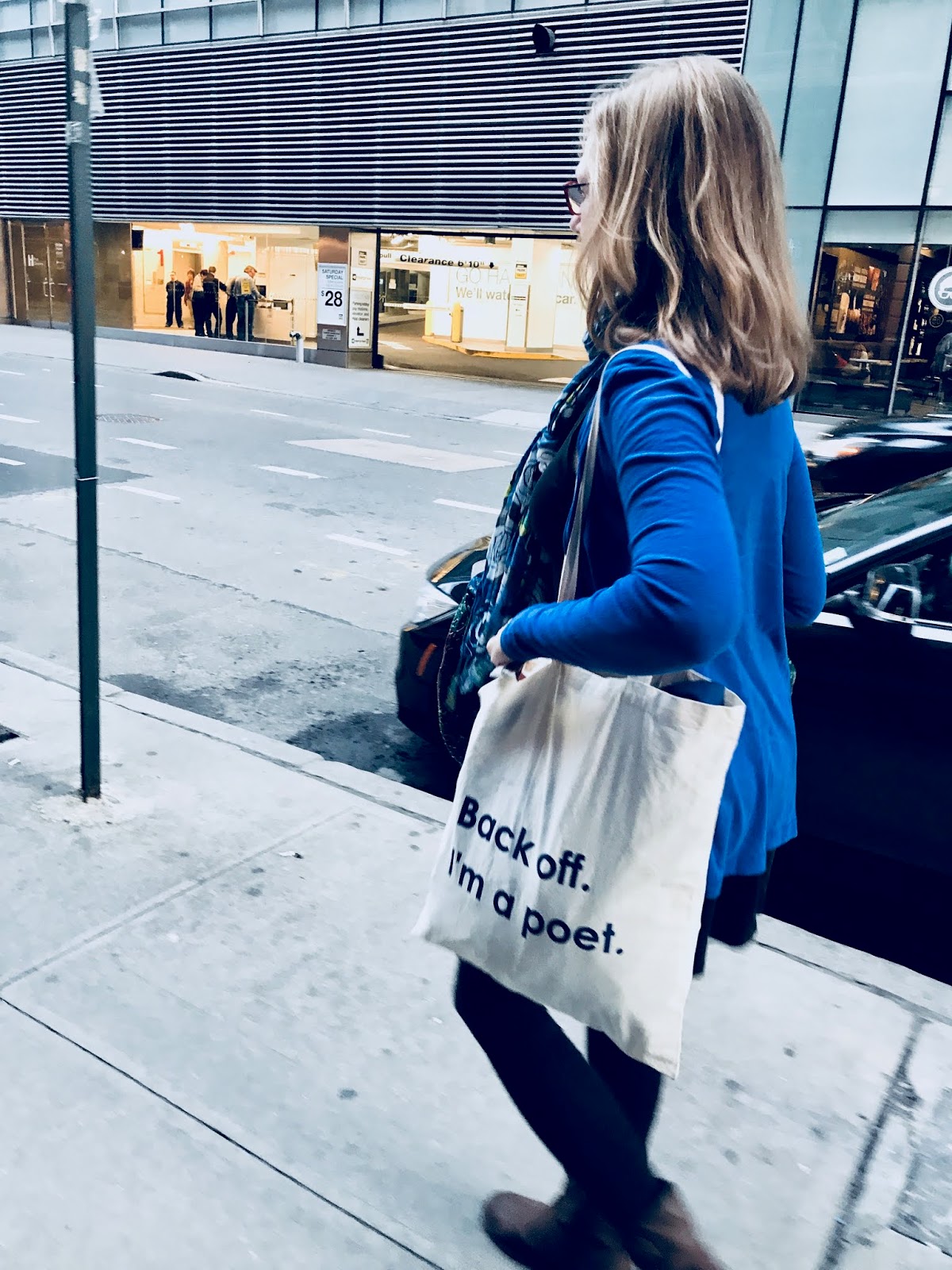 "Back off, I'm a poet."Finally, here's a pic of me with a poetry tote gifted me by dear friend Robyn Hood Black. Kind of the perfect accessory in New York City during National Poetry Month, yes? :)So many thanks to all involved! And readers, next time you are in New York City, be sure to visit Poet's House. It's all kinds of inspiring. I know you're going to love it!