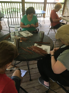 Lady Lakers!Friends, as with many primitive arts, this is so much harder than it looks! We started with walnut pieces for the center... and clumps of cleaned and boiled longleaf pine needles. (You have to prep the pine needles first by using fingernails or scissors to remove the bark-y cap on the end.) We used needles and waxed thread to start wrapping the straw around the walnut. We did our best to follow instructor Jane's every tip and direction. (Jane learned at John C. Campbell Folk School in North Carolina... totally on my bucket list to spend a week up there!)Some of us (me!) put in way more stitches than necessary attaching the first layer of pine needles to the walnut, and that kind of threw off the stitching design. Some of us (me!) realized pretty quickly that pine needle basketry was not our "thing." (Maybe it's my left-handedness? It just felt too... something. Probably I'll like it better the next time I try. :)