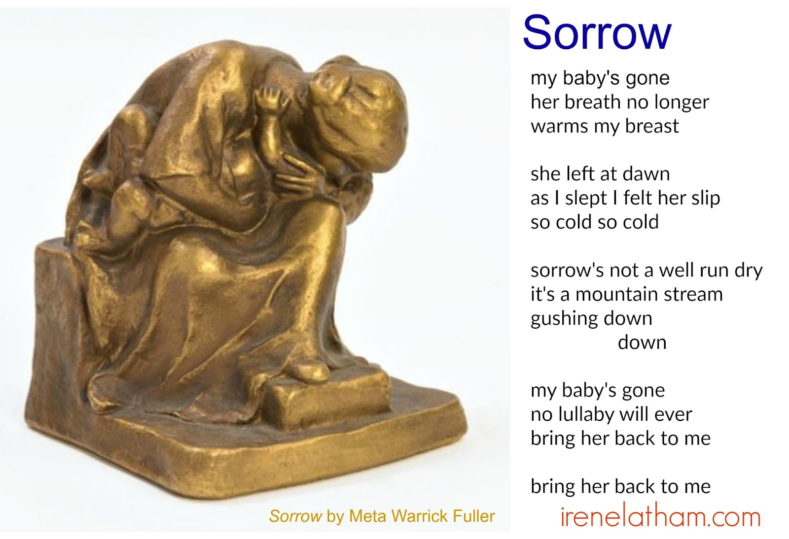 <!-- @page { margin: 0.79in } P { margin-bottom: 0.08in } </style> <br /><br /><div style="margin-bottom: 0in;"><b><span style="font-size: large;">“Let us train ourselves to see beauty in 'black.'”</span></b></div><br /><b>Here are the poems in the series so far:</b><br /><a href="http://irenelatham.blogspot.com/2018/... John Henry</a>" after <i>When John Henry Was a Baby</i> by Palmer Hayden<br /><a href="http://irenelatham.blogspot.com/2018/... Music"</a> after <i>Untitled</i> by Palmer Hayden<br /><a href="http://irenelatham.blogspot.com/2018/... (Sub)way of Looking"</a> after <i>The Subway, 1930</i> by Palmer Hayden<br /><a href="http://irenelatham.blogspot.com/2018/... to Mama"</a> after <i>Madonna at the Stoop</i> by Palmer Hayden<br /><div><a href="http://irenelatham.blogspot.com/2018/... Love of the Game" </a>after <i>Checkers Game</i> by Palmer Hayden</div><a href="http://irenelatham.blogspot.com/2018/... Birthday Birds of Bonaventure Island"</a> after <i>Birds of Isle de Bonaventure</i> by Palmer Hayden<br /><a href="http://irenelatham.blogspot.com/2018/... Dock, Early Evening</a>" after <i>Boats at the Dock</i> by Palmer Hayden<br /><a href="http://irenelatham.blogspot.com/2018/... for the Berry Pickers"</a> after <i>Berry Pickers</i> by Palmer Hayden<br /><a href="http://irenelatham.blogspot.com/2018/... Books Are the Only Playground I Need"</a> after <i>Among Them is a Girl Reading</i> by Palmer Hayden<br /><a href="http://irenelatham.blogspot.com/2018/... after <i>Octoroon Girl</i> by Archibald Motley<br /><a href="https://irenelatham.blogspot.com/2018... after <i>Barbecue</i> by Archibald Motley<br /><div><a href="http://irenelatham.blogspot.com/2018/... Idyll, 1934"</a> after <i>An Idyll of the Deep South</i> by Aaron Douglas<br /><a href="http://irenelatham.blogspot.com/2018/... Toiler"</a> after <i>The Toiler</i> by Aaron Douglas<br /><a href="http://irenelatham.blogspot.com/2018/... There Be Poetry" </a>after <i>The Creation</i> by Aaron Douglas<br /><a href="http://irenelatham.blogspot.com/2018/... with Plane"</a> after <i>Boy with Plane</i> by Aaron Douglas<br /><a href="http://irenelatham.blogspot.com/2018/... a Dancer"</a> after <i>Sahdji (Tribal Women)</i> by Aaron Douglas<br /><a href="http://irenelatham.blogspot.com/2018/... the Builders"</a> after <i>Building More Stately Mansions</i> by Aaron Douglas<br /><a href="http://irenelatham.blogspot.com/2018/... Poem is a Dream" </a>after <i>Aspiration </i>by Aaron Douglas<br /><br />Today's piece is called <i>Sorrow.</i> It shows a mother's anguish upon the death of a child. What a tough thing to write about... and the thing that immediately leapt to my mind was <a href="https://www.youtube.com/watch?v=9LtrX... Lover's Gone"</a> by Dido. I decided to use it as sort-of a mentor text. Also, I was thinking of <a href="https://www.youtube.com/watch?v=ttEMY... by Leonard Cohen. I love the lines: "Love is not a victory march, it's a broken Hallelujah." I wanted to see what I might say about sorrow. I'm not sure I've found "it" yet, but here is my start! I love when my mind turns to music for inspiration.<br /><i><br /></i><br /><div class="separator" style="clear: both; text-align: center;"><a href="https://3.bp.blogspot.com/-iQSHPqnUwc..." imageanchor="1" style="margin-left: 1em; margin-right: 1em;"><img border="0" data-original-height="1094" data-original-width="1600" height="272" src="https://3.bp.blogspot.com/-iQSHPqnUwc..." width="400" /></a></div><div class="separator" style="clear: both; text-align: center;"><br /></div><div style="font-style: normal; margin-bottom: 0in;"><b>Sorrow</b></div><div style="font-style: normal; margin-bottom: 0in;"><br /></div><div style="font-style: normal; margin-bottom: 0in;">my baby's gone</div><div style="font-style: normal; margin-bottom: 0in;">her breath no longer</div><div style="font-style: normal; margin-bottom: 0in;">warms my breast</div><div style="font-style: normal; margin-bottom: 0in;"><br /></div><div style="font-style: normal; margin-bottom: 0in;">she left at dawn</div><div style="font-style: normal; margin-bottom: 0in;">as I slept I felt her slip</div><div style="font-style: normal; margin-bottom: 0in;">so cold so cold</div><div style="font-style: normal; margin-bottom: 0in;"><br /></div><div style="font-style: normal; margin-bottom: 0in;">sorrow's not a well run dry</div><div style="font-style: normal; margin-bottom: 0in;">it's a mountain stream</div><div style="font-style: normal; margin-bottom: 0in;">gushing down </div><div style="font-style: normal; margin-bottom: 0in;"> down</div><div style="font-style: normal; margin-bottom: 0in;"><br /></div><div style="font-style: normal; margin-bottom: 0in;">my baby's gone</div><div style="font-style: normal; margin-bottom: 0in;">no lullaby will ever </div><div style="font-style: normal; margin-bottom: 0in;">bring her back to me</div><div style="font-style: normal; margin-bottom: 0in;"><br /></div><div style="font-style: normal; margin-bottom: 0in;">bring her back to me</div><div style="margin-bottom: 0in;"><i><br /></i></div><div style="margin-bottom: 0in;"><i>- Irene Latham</i></div><div class="separator" style="clear: both; text-align: left;"><style type="text/css"> <!-- @page { margin: 0.79in } P { margin-bottom: 0.08in } </style> </div></div><div style="margin-bottom: 0in;"><br /></div><i><br /></i><iframe allow="autoplay" frameborder="no" height="166" scrolling="no" src="https://w.soundcloud.com/player/?url=..." width="100%"></iframe>