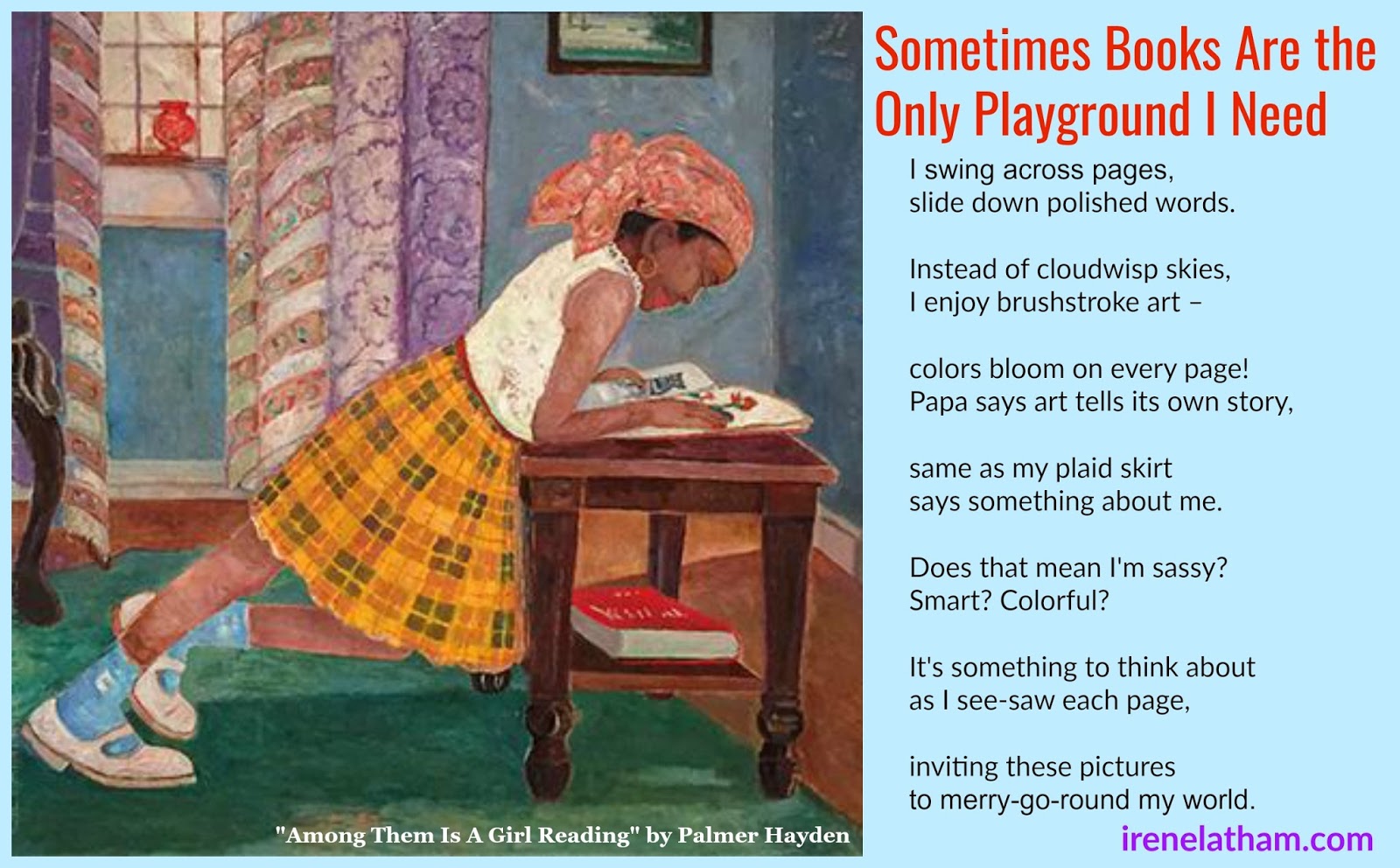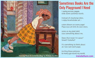 <!-- @page { margin: 0.79in } P { margin-bottom: 0.08in } </style> <br /><div class="separator" style="clear: both; text-align: center;"><a href="https://4.bp.blogspot.com/-MoeqmYOVTT..." imageanchor="1" style="margin-left: 1em; margin-right: 1em;"><img border="0" data-original-height="993" data-original-width="1600" height="247" src="https://4.bp.blogspot.com/-MoeqmYOVTT..." width="400" /></a></div><div style="font-style: normal; margin-bottom: 0in; page-break-before: always;"><b><br /></b></div><div style="font-style: normal; margin-bottom: 0in; page-break-before: always;"><b>Sometimes Books Are the Only Playground I Need</b></div><div style="font-style: normal; margin-bottom: 0in;"><br /></div><div style="font-style: normal; margin-bottom: 0in;">I swing across pages,</div><div style="font-style: normal; margin-bottom: 0in;">slide down polished words.</div><div style="font-style: normal; margin-bottom: 0in;"><br /></div><div style="font-style: normal; margin-bottom: 0in;">Instead of cloudwisp skies,</div><div style="font-style: normal; margin-bottom: 0in;">I enjoy brushstroke art –</div><div style="font-style: normal; margin-bottom: 0in;"><br /></div><div style="font-style: normal; margin-bottom: 0in;">colors bloom on every page!</div><div style="font-style: normal; margin-bottom: 0in;">Papa says art tells its own story,</div><div style="font-style: normal; margin-bottom: 0in;"><br /></div><div style="font-style: normal; margin-bottom: 0in;">same as my plaid skirt</div><div style="font-style: normal; margin-bottom: 0in;">says something about me.</div><div style="font-style: normal; margin-bottom: 0in;"><br /></div><div style="font-style: normal; margin-bottom: 0in;">Does that mean I'm sassy?</div><div style="font-style: normal; margin-bottom: 0in;">Smart? Colorful?</div><div style="font-style: normal; margin-bottom: 0in;"><br /></div><div style="font-style: normal; margin-bottom: 0in;">It's something to think about</div><div style="font-style: normal; margin-bottom: 0in;">as I see-saw each page,</div><div style="font-style: normal; margin-bottom: 0in;"><br /></div><div style="font-style: normal; margin-bottom: 0in;">inviting these pictures</div><style type="text/css"> <!-- @page { margin: 0.79in } P { margin-bottom: 0.08in } </style> <br /><div style="margin-bottom: 0in;">to merry-go-round my world.</div><div style="margin-bottom: 0in;"><i>- Irene Latham</i></div><iframe allow="autoplay" frameborder="no" height="166" scrolling="no" src="https://w.soundcloud.com/player/?url=..." width="100%"></iframe>