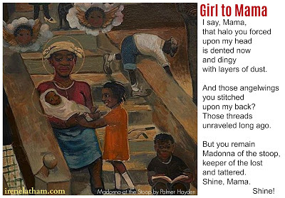 But you remainMadonna of the stoop,keeper of the lostand tattered.Shine, Mama. <!-- @page { margin: 0.79in } P { margin-bottom: 0.08in } </style> </span></span><br /><div style="margin-bottom: 0in;"> Shine!</div><div style="margin-bottom: 0in;"><i><br /></i></div><div style="margin-bottom: 0in;"><i>- Irene Latham</i></div><iframe allow="autoplay" frameborder="no" height="166" scrolling="no" src="https://w.soundcloud.com/player/?url=..." width="100%"></iframe>